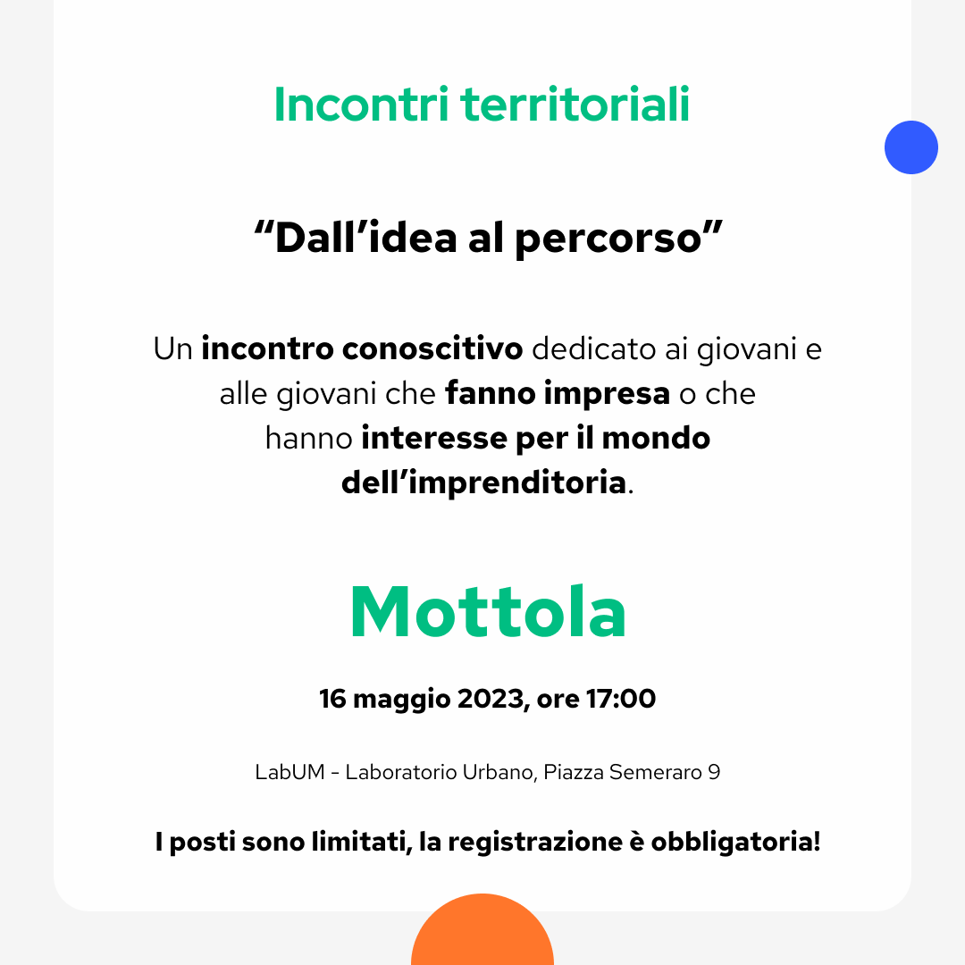 L'incontro si svolgerà presso LabUM - Laboratorio Urbano, Piazza Semeraro, 9 a Mottola. I posti sono limitati, per la partecipazione è necessario registrarsi entro le ore 18.00 del 15 maggio 2023